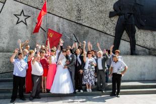 После регистрации брака свадебная колонна машин направилась к вечному огню где молодая семья отдали дань памяти героям защищавшим советскую Родину от фашистских захватчиков. После чего молодожен встретили коммунисты Приобского райкома г.Бийска и Бийское отделение ВЖС «Надежда России».