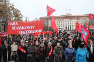 День 7 ноября уже не красный день календаря, но несмотря на это в 10 часов утра у технопарка начали собираться коммунисты и наши сторонники. Две коммунистические партии КПРФ и РКРП шли в одной колонне, между ними шел духовой оркестр, который поднимал настроение демонстрантам. Погода тоже благоприятствовала нам. Власти перекрыли одну сторону улицы Республики, и дали возможность собравшимся построиться в колонну по 8 человек.