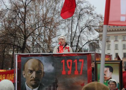 После звучания партийного гимна Интернационала слово было предоставлено первому секретарю Тюменского обкома КПРФ Тамаре Казанцевой. Она поздравила всех собравшихся с 96 годовщиной Великого Октября от имени Центрального комитета КПРФ и от себя, сказала, что главные лозунги КПРФ: «Вперед к социализму!», «Правительство Медведева в отставку!»
