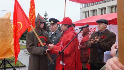 Митинг открыла и вела первый секретарь Калужского горкома КПРФ, депутат Законодательного Собрания Калужской области М.В.Костина. Она поздравила участников митинга с праздником Великого Октября. Под дружные аплодисменты комсомольские билеты были вручены Никите Резакову и Геннадию Вагайцеву.