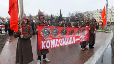 По многолетней традиции в 10-20 праздничная колонна под духовой оркестр направилась к площади Ленина. В начале колонны – комсомольцы в красноармейских шинелях и буденовках с растяжкой: «Комсомолу – 95!». На красном полотнище – шесть орденов Советского Союза, которыми Родина отметила боевые и трудовые заслуги комсомола.