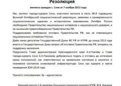 В Резолюции митинга были внесены требования отставки Правительства РФ, а также призыв к Главе администрации Краснодарского края Ткачёву и главе города-курорта Сочи Пахомову, как проводников ущербной политики Правительства, добровольно подать в отставку до истечения сроков их полномочий (текст резолюции прилагается).
