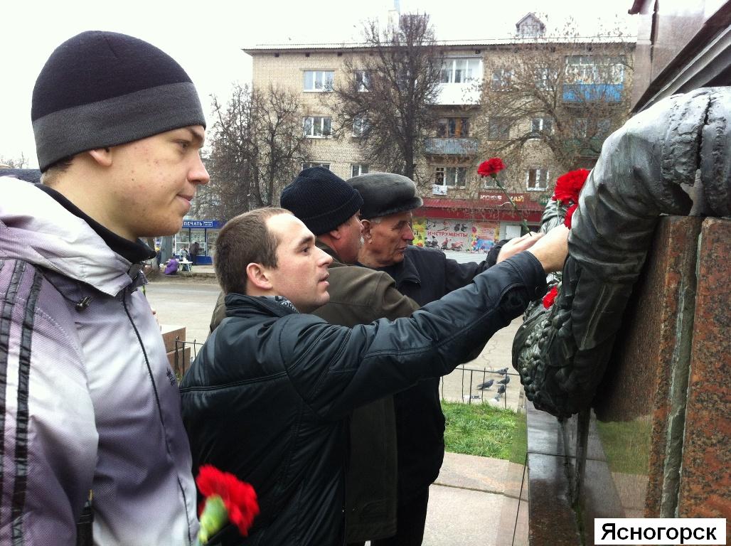 Ясногорск. Здесь в 11.00 состоялось возложение цветов к памятнику В.И. Ленина, организатором которого выступили первый секретарь райкома партии А.В.Бирюков и второй секретарь райкома партии М.С.Дронов. После возложения М.С.Дронов с группой молодых коммунистов принял участие в праздничных мероприятиях в Туле.