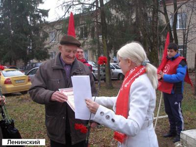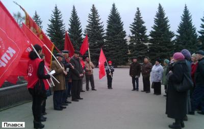 В Новомосковске в Аллее Славы перед памятником В.И.Ленину состоялся митинг, в котором приняли участие не менее 300 человек. Особое внимание его участников было приковано к коммунисту А.С.Трусову, ветерану советско-финской и Великой Отечественной войн, которому 4 ноября исполнилось 99 лет. Тем не менее, он прибывает в завидной физической форме, на митинг пришёл сам, пешком и выступил перед собравшимися. В частности, он рассказал, как строили химкомбинат, каких усилий это стоило, какой был энтузиазм у тогдашних комсомольцев.