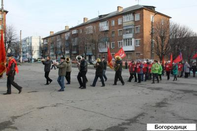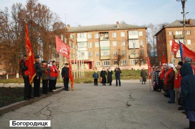 В Богородицке по традиции провели и шествие, и митинг, в которых приняли участие около 100 человек. Собравшиеся под музыку духового оркестра прошли по центру города, возложили цветы к памятнику В.И.Ленину. На митинге выступили депутат районного и городского Собраний, первый секретарь местного отделения КПРФ В.К.Кушнир, депутат горсобрания, секретарь горкома Т.И.Леонова, ветеран партии В.Н.Ткачёв, местный предприниматель и общественный деятель В.А.Морозов и другие товарищи.