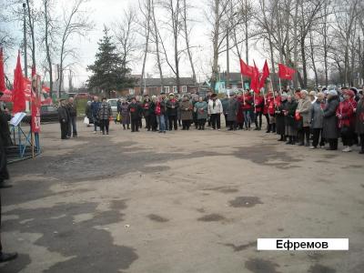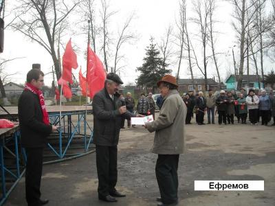 На митинге выступили депутат Тульской областной Думы, первый секретарь Ефремовского горкома КПРФ О.Е.Веселов, депутаты Ефремовского городского Собрания депутатов А.В.Бормотов, А.А.Пыршов, а также П.Ф.Мальцев и председатель профсоюзной первички музыкальной школы С.В.Молчанов. На митинге присутствовали 125 чел. После праздничных мероприятий депутат городского Собрания А.В.Бормотов провел очередной прием избирателей Ефремова.