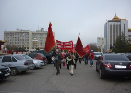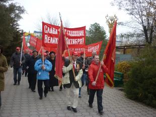 Коммунисты и сторонники партии, общественные движения КРО ВЖС-Надежда России», «Дети войны» и «Русский Лад» прошли 7 ноября 2013 года в городе Элиста с транспорантами, флагами «КПРФ» и шарами под приветствия и.о. I секретаря ЭМО КПРФ Манкурова А.К., с возгласами «Ура» по центральным улицам В.Ленина и ул. М.Горького к памятнику В.И.Ленина.