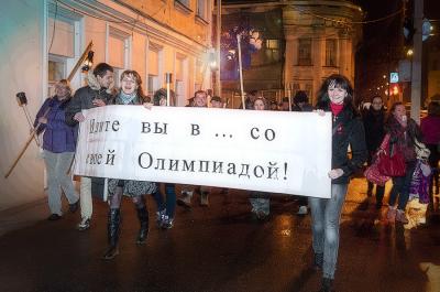 Наконец, развернули плакат с простыми словами: «Идите вы в … со своей Олимпиадой!». Взяли керосинки, лампадки, даже демонстративно подняли незажжённые факелы и двинулись по той самой улице Симановского. В мегафон звучали спортивные песни (Высоцкого «Утренняя гимнастика» и «Про левшей и правшей», «Футбольный марш», «Трус не играет в хоккей», «Команда молодости нашей» и др.). Звучали речёвки: «Ударим антиолимпийским шествием по распилу бабла на Олимпиаде!», «Товарищей Билаловых – на нары!», «Долой толстопузов!», «Дайте денег детям на спорт!», «Олимпиада в Сочи – это не гордость, это позор», «Полтора триллиона куда ушли? В песок!» и другие. Прохожие с удивлением и явным одобрением слушали и смотрели на пару десятков молодёжи, весело и громко шагающих по улице. Несколько машин просигналило.