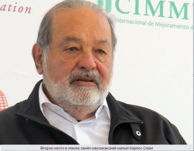 Второе место в списке занял мексиканский магнат Карлос Слим, на счетах которого более 73 миллиардов долларов. Для него прошлый год был не столь удачным: Слим не только уступил место самого состоятельного человека в мире Гейтсу, но и потерял около 1,4 миллиарда долларов.
