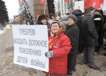 Его участники вышли с плакатами: «Тарифы ЖКХ вывернут всем потроха!», «Детям войны – государственную поддержку!», «Терпение детей войны не безгранично!» и «Бедность народа – позор власти!».