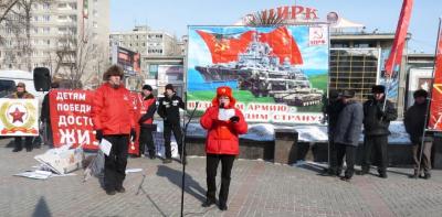 Затем перед собравшимися выступила первый секретарь обкома КПРФ, депутат Госдумы РФ О.Н. Алимова. В своей яркой, запоминающейся речи, она выразила уверенность в том, что Российские Армия и Военно-Морской Флот, следуя великим традициям непобедимой и легендарной советской Красной Армии и Военно-Морского Флота, останутся несокрушимым гарантом национального суверенитета и целостности нашей Родины, надежной опорой граждан России в их борьбе за свои права и социальную справедливость. КПРФ будет и впредь находиться во главе борьбы всех честных людей России против буржуазной власти, против коррупционеров и взяточников, и не позволит недругам страны подорвать оборонную мощь страны и погубить Россию! В сложившейся обстановке мы все должны понять, что достойное будущее абсолютного большинства населения нашей страны и её Армии напрямую связано с социалистическим возрождением России. Оно не возможно без коренного изменения социально – экономического курса страны!