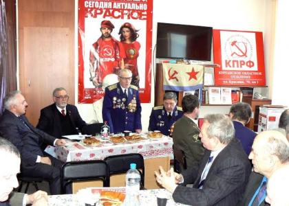 В субботу, 22 февраля в Курганском обкоме КПРФ прошло торжественное собрание общественности Кургана, посвященное Дню рождения Советской Армии и Военно-Морского флота. С докладом выступил председатель Союза советских офицеров подполковник А.Г.Попов. От имени Компартии собравшихся поздравил с праздником член ЦК КПРФ В.А.Кислицын, который также вручил памятные награды КПРФ наиболее активным общественникам, которые ведут большую военно-патриотическую работу. Он познакомил участникам собрания Заявление Президиума ЦК КПРФ по ситуации на Украине. Оно было полностью поддержано общественностью областного центра.