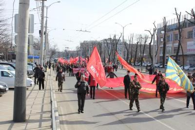 Колонна под Знаменами Победы, родов войск и флагами КПРФ и ЛКСМ, а также общественной организации «Дети войны» выстроилась в центре города, рядом с администрацией края.