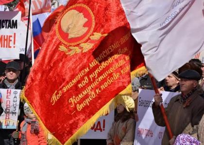 Коммунисты пришли на митинг со знаменами СССР, КПРФ и копией Знамени Победы и развернули плакаты: «Украина. Да – поддержке, нет – войне», «Нет фашизму в Украине и в России», «Долой нелегитимную власть», «Нет бандитским переворотам», «Власть народу, а не криминалу».