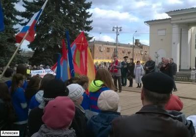 Алексин. Здесь митинг состоялся ещё в пятницу, 14 марта. Выступая от имени коммунистов, заместитель председателя областной Думы Юрий Моисеев напомнил, что Украина всегда была юго-западным форпостом России. Веками завоеватели всех мастей – немцы с австрийцами, поляки, турки, а теперь и американцы – пытались захватить её, поработить, оторвать от России и сделать враждебной России. Для этого они всеми способами поддерживали антирусские силы на Украине. Что же касается Крыма, то он с самого начала кризиса обозначил чёткую и жёсткую позицию, не захотел жить в такой Украине и, объявив о независимости, назначил референдум о воссоединении с Россией. В ответ на запугивания нашей страны санкциями и угрозой изоляции, Ю.Моисеев напомнил, что у нас есть два надёжных союзника – Российская армия и Военно-морской флот, что было встречено аплодисментами собравшихся.