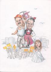 И ещё. Чтобы внести свой вклад в «копилку» развесёлых городских праздников, предлагаю возвести в Мурманске новый монумент (см. рисунок). Полагаю, городу в качестве духовных скреп необходим памятник «Прораб и Табуреткин», подобный известнейшему памятнику «Рабочий и Колхозница». Предлагаю открыть его с помпой, удалыми песнями, зажигательными танцами, фейерверком – на главной площади города. А перед этим уволить всех чиновников, которым по штату положено организовывать подобные мероприятия и контролировать расходование городского бюджета.