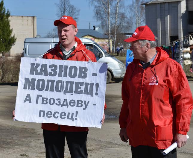 Поддержать своего товарища съехались коммунисты Иванова, Шуи, Кинешмы, Вичуги и Вичугского района. Они вышли с плакатами «Нет политическому бандитизму в Вичугском районе», «Гвоздев! Руки прочь от нашего товарища!», «Мурашкин и Гвоздев! Борьба с коммунистами приводит к фашизму!», «Гвоздев! У тебя посёлок разваливается, а ты в политику лезешь!», «Казнов – молодец! А Гвоздеву – песец!», «С такой властью захиреешь!».