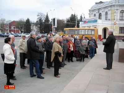 Перед собравшимися выступил первый секретарь Тамбовского обкома КПРФ А.И. Жидков. Андрей Игоревич отметил выдающуюся роль Ленина в мировой и отечественной истории. В.И. Ленин вместе с Коммунистической партией впервые в мире соединил теорию социализма с рабочим движением, борьбу рабочих за экономические требования с политической борьбой против самодержавия. Его гениальная идея союза рабочего класса и крестьянства подняла на борьбу против эксплуататоров всё эксплуатируемое население страны.