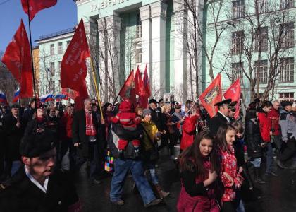 Гордо несут копии Знамени Победы первый секретарь Мурманского обкома КПРФ, руководитель фракции КПРФ в Мурманской областной Думе Г.В. Степахно, второй секретарь Мурманского обкома, депутат Мурманской областной Думы М.В. Антропов, первый секретарь Мурманского горкома КПРФ, руководитель областного штаба протестных действий, депутат Мурманской областной Думы О.Г. Панина, депутат Мурманской областной Думы Ю.В. Ваталин, а также активисты Мурманской городской организации КПРФ В.Н. Пеляк, А.А. Крупка, Т.А. Ковалева, В.В. Яранцев, И.И. Зива, М.С. Пелевина и другие.