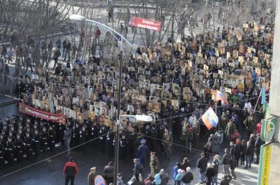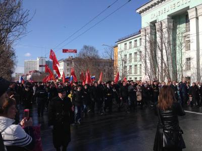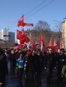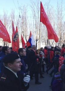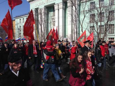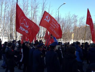 Гордо несут копии Знамени Победы первый секретарь Мурманского обкома КПРФ, руководитель фракции КПРФ в Мурманской областной Думе Г.В. Степахно, второй секретарь Мурманского обкома, депутат Мурманской областной Думы М.В. Антропов, первый секретарь Мурманского горкома КПРФ, руководитель областного штаба протестных действий, депутат Мурманской областной Думы О.Г. Панина, депутат Мурманской областной Думы Ю.В. Ваталин, а также активисты Мурманской городской организации КПРФ В.Н. Пеляк, А.А. Крупка, Т.А. Ковалева, В.В. Яранцев, И.И. Зива, М.С. Пелевина и другие.