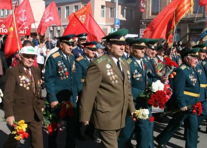 «Слава советскому воину-победителю!» – скандируют участники шествия, – «Да здравствует Генералиссимус Победы Иосиф Виссарионович Сталин!», «Да здравствует Коммунистическая партия — партия Победы», «Возродим мощь и былую славу вооруженных сил!».