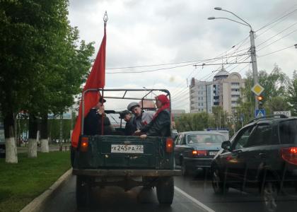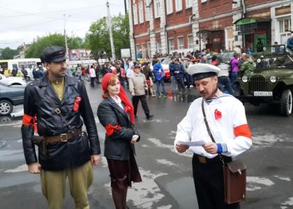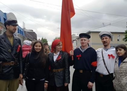 Переодетые в форму комиссаров и матросов периода Октябрьской революции, на ретроавтомобиле ГАЗ-69 с открытым «верхом» и прикрепленным, развевающимся по ветру красным флагом, четверо молодых людей курсировали по улицам города, по маршруту движения посетив несколько музеев: «Город», «Мир времени», краеведческий и ряд других. Поздравляли горожан с праздником и зачитывали Декрет Совнаркома РСФСР 1918 года. Данным документом Советская власть запрещала вывоз за границу предметов искусства и старины.