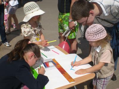 Кроме рисования желающие принимали участие в музыкальном конкурсе. Дети исполняли под аккордеон с музыкальным руководителем Т.Иванченко песни "Пусть всегда будет солнце!", "Вместе весело шагать", "Если с другом вышел в путь"... Малыши читали стихи о маме, о солнце. Все выступления юных исполнителей встречали громкими аплодисментами. А под песню меленьких утят взрослые и дети взялись за руки и стали дружно танцевать. Юные калужане под дружные аплодисменты запустили в небо символ мира — белых голубей...