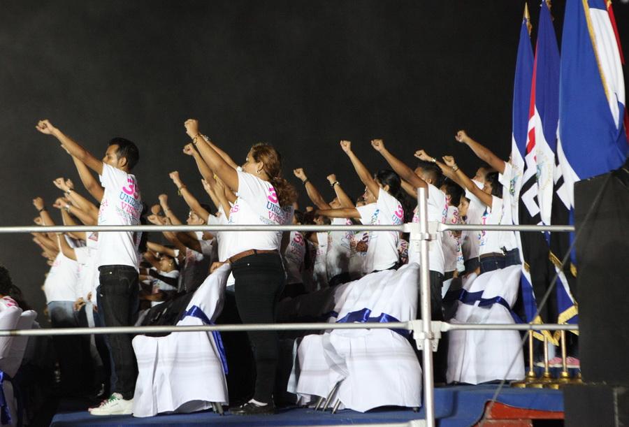 К 18 часам все пространство площади и прилегающих улиц заполнилось людьми с флагами Никарагуа и сандинистов. Вскоре начался торжественный митинг. В ходе его проведения выступили ближайшие соседи и союзники по борьбе за экономическую и политическую независимость стран Латинской Америки. В частности, слово было предоставлено заместителю председателя государственного совета Кубы и президенту Гондураса. Дружно была поддержана речь президента Венесуэлы Николаса Мадуро.