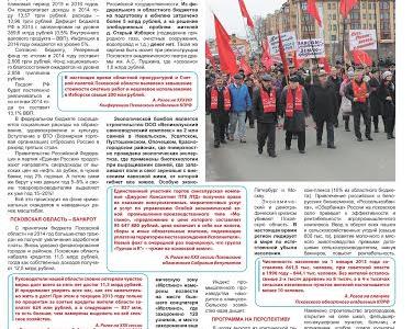 «Информационный бюллетень» сообщает, что Псковская область – банкрот. С принятием бюджета на 2014 год большинство граждан не получат увеличения заработной платы. Вновь урезано финансирование городов и районов. Псковская область набрала кредитов на 11,5 млрд рублей, тогда как собственных доходов получает 12,5 млрд рублей. В псковском регионе осталось 6 централизованных больниц на 24 района, Псков и Великие Луки. Недостаток врачей узких специальностей в области превышает 1300 человек.