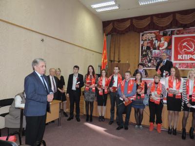 Затем по славной традиции со словами напутствия член президиума ЦК КПРФ В.С.Шурчанов торжественно вручил партийные билеты 25 молодым коммунистам Барды, Березников и Перми.