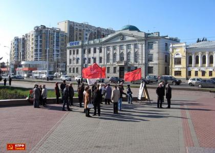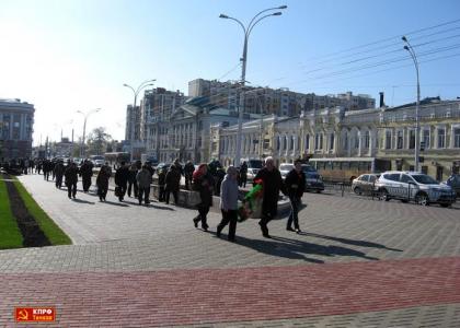 После пикета коммунисты направились к памятнику В.И. Ленину, расположенному на центральной площади областного центра и возложили венок и цветы к подножию монумента.