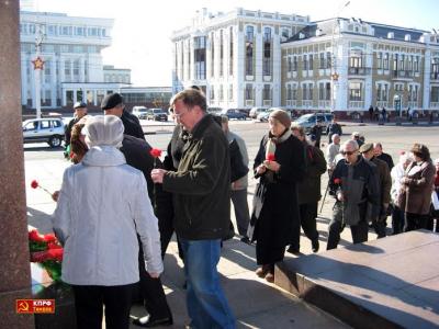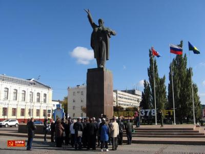 После пикета коммунисты направились к памятнику В.И. Ленину, расположенному на центральной площади областного центра и возложили венок и цветы к подножию монумента.