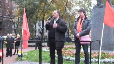 Руководитель СПб отделения ВСД «Русский Лад», заместитель руководителя фракции КПРФ в ЗакС Санкт-Петербурга Алексей Васильевич Воронцовобратился к участникам митинга с проникновенной речью о русском, советском мире, который сегодня начал воскресать, и который необходимо защищать от атаки античеловеческих сил. Сегодня главный фронт борьбы за русский мир и социализм находится в Новороссии, и мы обязаны всеми силами помогать Народным Республикам, - заявил Воронцов.