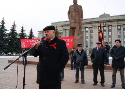 "97 лет Великой Октябрьской Социалистической революции неразрывно связано с именем В.И. Ленина. Когда наши политики уже больше 20 лет кормят народ пустыми разговорами, хочется у них спросить, может быть, кто-то из вас придумал и воплотил в жизнь лучшие лозунги, чем те, что были у Ленина, которые на заре советской власти овладевали массами и вели их на великие свершения? Сегодня нет ничего хотя бы отдаленно напоминающего те лозунги, под которыми восстанавливалась страна в ленинскую эпоху: "Хлеб - голодным!", "Мир - народам!", "Заводы - рабочим!", "Земля - крестьянам!", "Власть - советам!". Мог ли тогда кто-нибудь лучше и более точно отразить интересы и настроения граждан? ХХ век - это век Ленина и Сталина, век высокого патриотизма и удивительного героизма наших предшественников и огромной любви к советской Родине, к социалистическому Государству, рожденному Великим Октябрем и мы обязаны хранить это наследство", – сказал секретарь по протестному движению Кировского обкома КПРФ Владимир Иванович Осетров, открывая митинг.