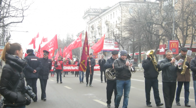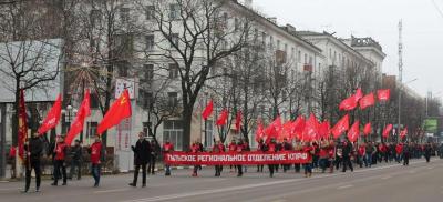 И снова торжественное шествие демонстрантов. В руках участников знамена КПРФ, Знамена Победы, флаги СССР. В колоне много молодых коммунистов Центрального, Советского, Зареченского райкомов партии г. Тулы. Под патриотические песни и марши духового оркестра и лозунги: «Для нас навсегда серп и молот, и звезда!», «Завершим реформы так – над страной Красный флаг!», «Сказал же Ленин ясно – Россия будет Красной!», колонна дошла до Сквера Коммунаров, где состоялся праздничный митинг.