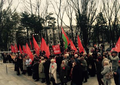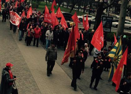 «Слава Великому Октябрю!», «Долой министров-капиталистов!», «Нет НАТО – на русской земле», «Новороссия, мы с тобой!» – такими были главные транспаранты, растянутые вдоль колонны. Духовой оркестр при этом на протяжении всего маршрута исполнял марши и мелодии советской поры.