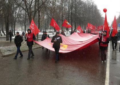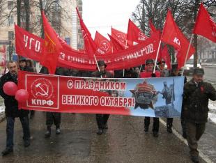 Сбор коммунистов и сторонников КПРФ был назначен около памятника Ю. А. Гагарину, где звучали советские песни и лозунги в честь Великого Октября. Несмотря на мокрый снег и слякоть под ногами, народу собралось много. Все желающие могли получить свежий номер газеты «Чебоксарская правда». Ровно в 13.00 праздничная колонна с флагами, лозунгами, красными шариками двинулась по центральному проспекту к площади Республики. Общее внимание привлёк огромный флаг СССР, который несли коммунисты и комсомольцы. По дороге к колонне присоединялись все желающие. Многие пришли с детьми.