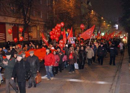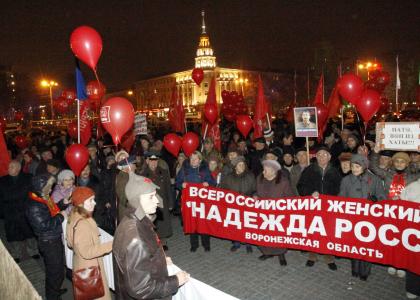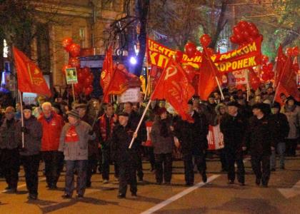 Вечером 7 ноября проспект Революции окрасился в кумачовый цвет. Десятки флагов СССР и КПРФ, красные шары с партийной символикой, красные накидки, шарфы и бантики, портреты В.И. Ленина и И.В. Сталина, лозунги: «Да здравствует 97-я годовщина Великого Октября!», «Россия! Труд! Народовластие! Социализм!», «Ленин жил, Ленин жив, Ленин будет жить!», «Программу КПРФ – в жизнь!», «Заводы – рабочим! Землю – крестьянам! Мир – народам!», «Россия и Новороссия – одна история, одна судьба», «НАТО, вон из хаты!», «КПРФ за мир!», «Детям войны – статус и льготы!» создавали праздничное, боевое настроение. В составе краснознамённой колонны - активисты КПРФ, Ленинского комсомола, Союза советских офицеров, организации «Дети военного времени» и женского союза «Надежда России» с растяжками своих организаций, представители трудовых коллективов – концерна «Созвездие», КБХА, «Электросигнала», механического и авиационного заводов, вузов Воронежа.