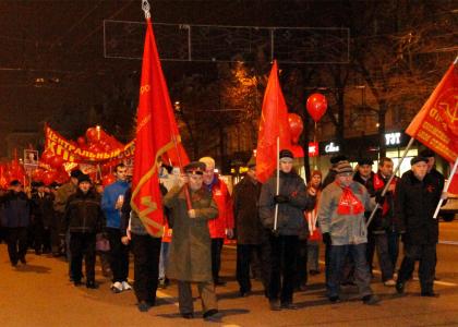 Во главе демонстрантов – знаменосцы с копией знамени Победы, знаменами областных отделений КПРФ, Ленинского комсомола, Союза советских офицеров. «Изюминкой» стала инициатива коммунистов Коминтерновского района, которые вышли на демонстрацию с многометровым красным полотнищем флага СССР.