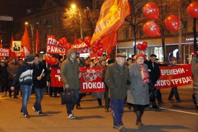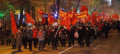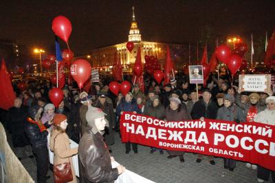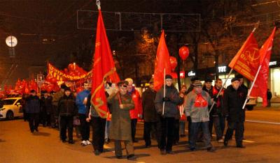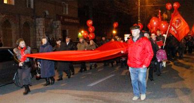 Вечером 7 ноября проспект Революции окрасился в кумачовый цвет. Десятки флагов СССР и КПРФ, красные шары с партийной символикой, красные накидки, шарфы и бантики, портреты В.И. Ленина и И.В. Сталина, лозунги: «Да здравствует 97-я годовщина Великого Октября!», «Россия! Труд! Народовластие! Социализм!», «Ленин жил, Ленин жив, Ленин будет жить!», «Программу КПРФ – в жизнь!», «Заводы – рабочим! Землю – крестьянам! Мир – народам!», «Россия и Новороссия – одна история, одна судьба», «НАТО, вон из хаты!», «КПРФ за мир!», «Детям войны – статус и льготы!» создавали праздничное, боевое настроение. В составе краснознамённой колонны - активисты КПРФ, Ленинского комсомола, Союза советских офицеров, организации «Дети военного времени» и женского союза «Надежда России» с растяжками своих организаций, представители трудовых коллективов – концерна «Созвездие», КБХА, «Электросигнала», механического и авиационного заводов, вузов Воронежа.