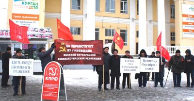 В Кургане 7 ноября одновременно в двух людных местах – на площадках у кинотеатра «Россия» и у памятника Коле Мяготину прошли массовые пикеты с красочными лозунгами и транспарантами, с раздачей газет и листовок. После чего были возложены цветы у памятника В.И.Ленину. Затем прошли автопробеги с красными флагами сразу по двум направлениям, охватывающим практически весь город. Областной центр украсился красочными баннерами.