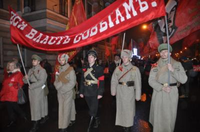 Не будет лишним подчеркнуть, что в этом году коммунисты творчески подошли к организации праздничных мероприятий – во главе колонны коммунистов шли революционные матросы и солдаты под лозунгом «Власть Советам!», а ленинградские комсомольцы изготовили и несли перед колонной трехметровое полотнище с изображением легендарной «Авроры», подсвеченное светодиодами, что особенно ярко смотрелось в темное время суток. А уже на месте проведения митинга его участников ждали новые сюрпризы – над сценой был при помощи лазеров спроецирован силуэт крейсера Революции, а между выступлениями на митинге любимые всеми музыкальные композиции исполняли артист театра и кино, коммунист Рафаил Эйвазов и Народный артист Российской Федерации, Заслуженный артист РСФСР Виктор Кривонос.