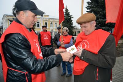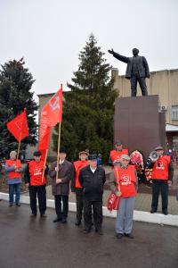 На проведение праздничного митинга под красными флагами СССР и КПРФ у памятника В.И. Ленину собралось около 150 человек - активисты КПРФ, Союза советских офицеров, Движения в поддержку армии оборонной промышленности и военной науки. Перед началом мероприятия к постаменту памятника вождю трудового народа были возложены цветы.