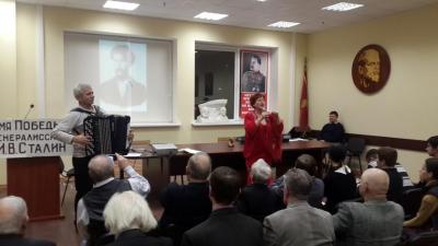 Концертную часть программы вечера открыло выступление заслуженной артистки России Раисы Левашовой, которая спела несколько песен из репертуара Клавдии Шульженко – знаменитой советской певицы сталинской эпохи. Порадовал вокальным искусством и баянист, заслуженный артист России Юрий Фабричных, спевший знаменитую песню «Артиллеристы, Сталин дал приказ». Его почин подхватил красный бард, секретарь обкома Андрей Померанцев, в своём искромётном, зажигательном стиле исполнивший несколько советских песен. Собравшиеся в зале люди горячо аплодировали и подпевали. Все словно стряхнули с себя груз проблем, почувствовали себя мощной, сплочённой силой, молодой и энергичной.