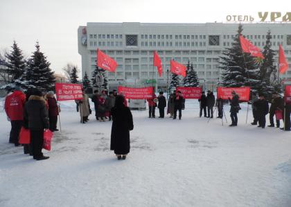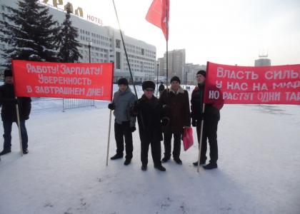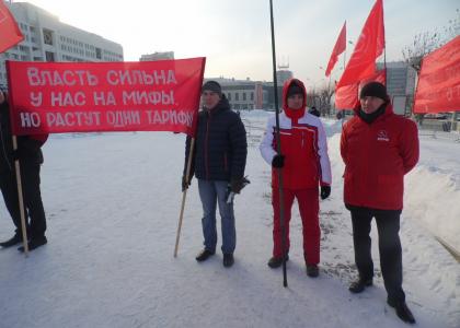 Невзирая на морозную погоду, митингующие подняли флаги КПРФ и развернули транспаранты с яркими и броскими лозунгами: «Работу! Зарплату! Уверенность в завтрашнем дне!», «Право на труд = право на жизнь!», «Путин, ответь! В чьих карманах прибыль от бензина?», «Отечественная промышленность – залог безопасности страны!», «Капиталисты нас достали! Приходи товарищ Сталин!», «Прогрессивный налог на роскошь – залог снижения цен и тарифов!», «Наш курс – труд! Народовластие! Социализм!», «Цены и тарифы под контроль государства!», «Правительство министров-капиталистов в отставку!».