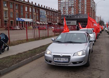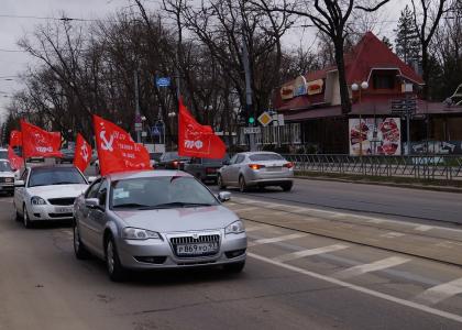 В ознаменование 72-ой годовщины освобождения Краснодара от немецко-фашистских захватчиков "красный автопоезд" с красными знаменами КПРФ и Победы совершила автопробег по улицам города.