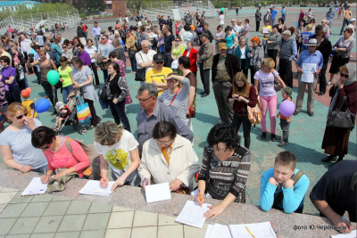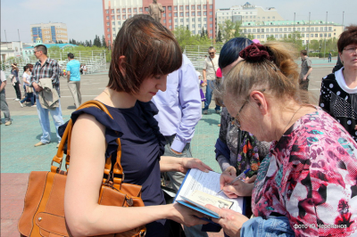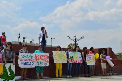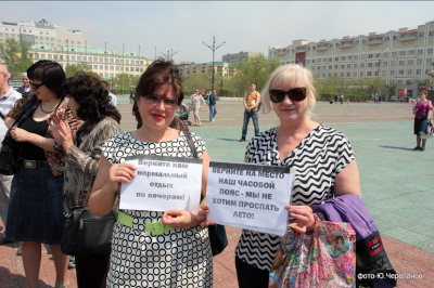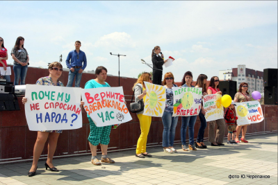 На площади имени В.И.Ленина собралось более тысячи читинцев. Слово для выступления со сцены брали многодетные матери, пенсионеры, предприниматели, медики. Все они рассказывали о проблемах, вызванных переводом времени на два часа назад. От Коммунистической партии выступила Екатерина Щербакова второй секретарь горкома, депутат городской думы.