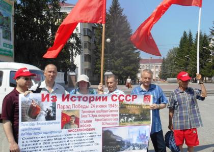 24 июня коммунисты Кургана напомнили жителям областного центра о Параде Победы 1945 года, 70-летие которого исполнилось сегодня. Онипровели у кинотеатра «Россия» рядом с мемориалом Победы массовый пикет, на который пришли во главе с первыми секретарями обкома и горкома партии В.А.Кислицыным и Я.С.Сидоровымс красными знаменами и большим ярким плакатом, рассказывающим об историческом событии.