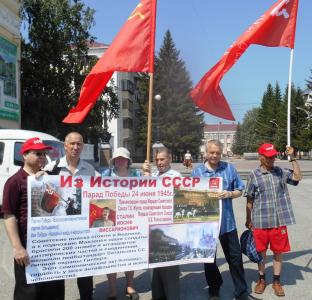 24 июня коммунисты Кургана напомнили жителям областного центра о Параде Победы 1945 года, 70-летие которого исполнилось сегодня. Онипровели у кинотеатра «Россия» рядом с мемориалом Победы массовый пикет, на который пришли во главе с первыми секретарями обкома и горкома партии В.А.Кислицыным и Я.С.Сидоровымс красными знаменами и большим ярким плакатом, рассказывающим об историческом событии.