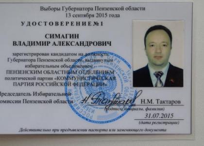 Избирательная комиссия Пензенской области 31 июля приняла решение о регистрации депутата Государственной Думы, секретаря Пензенского обкома КПРФ Владимира Симагина кандидатом в губернаторы Пензенской области. Председатель облизбиркома Николай Тактаров вручил ему удостоверение кандидата за № 1.